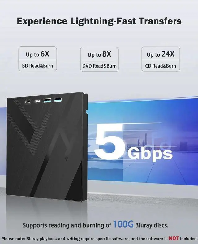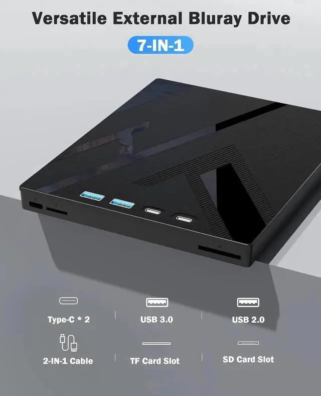 This blu ray burner offers versatile features. It has 1*SD card slot, 1*TF card slot, 2*Type-C ports, 1*USB 3.0 +1*USB 2.0 ports, and 1*2-in-1 cable(usb 3.0 +type-c) for data transfer or charging purposes. It supports reading BD/DVD/CD discs and writing BD/DVD/CD discs. You can easily copy music, movies, and data files from SD cards, TF cards, or through the USB/Type-C ports to your computer. You can also transfer files from a Bluray player to an SD card, USB hard drive, or USB flash drive. Please note that the SD card and TF card cannot be used simultaneously; you can only choose one at a time.