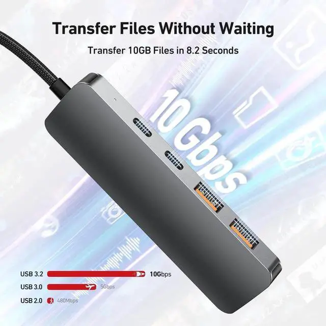 10Gbps Fast Data Transfer: USB C 3.2 hub can transfer 10GB files, HD movies, or songs in just 8.2 seconds, it is 2x faster than USB 3.0 and 20x faster than USB 2.0, which would maximize your productivity via 10Gbps USB C to USB hub.