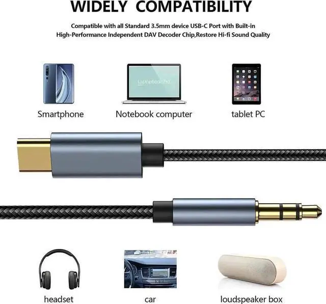 Type C to Aux for home stereo. When you'+re at home, you can connect to your home stereo, and The USB to audio jack( 3.2 ft/1M) is long enough for you to use Conveniently.