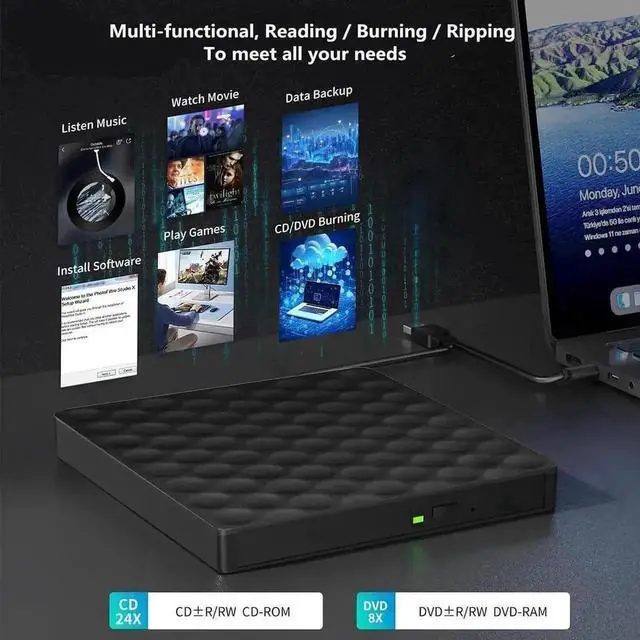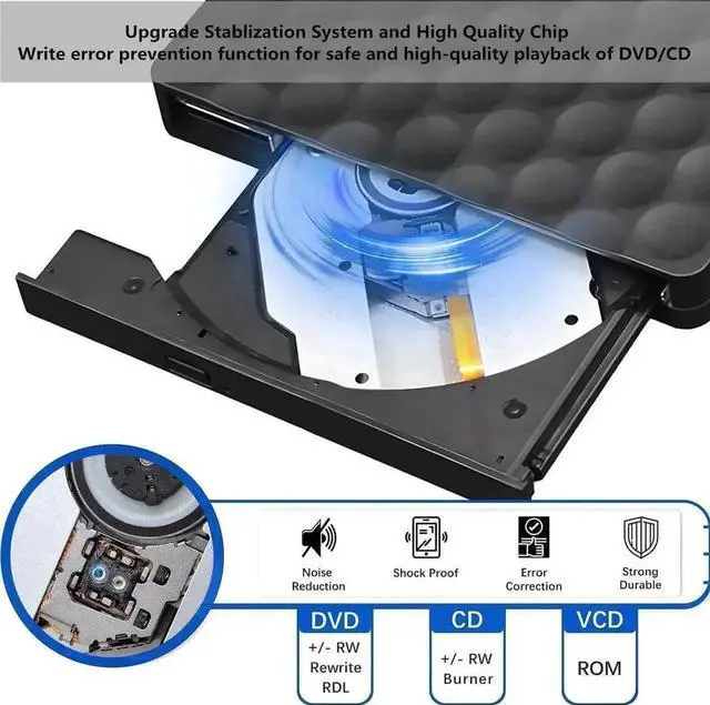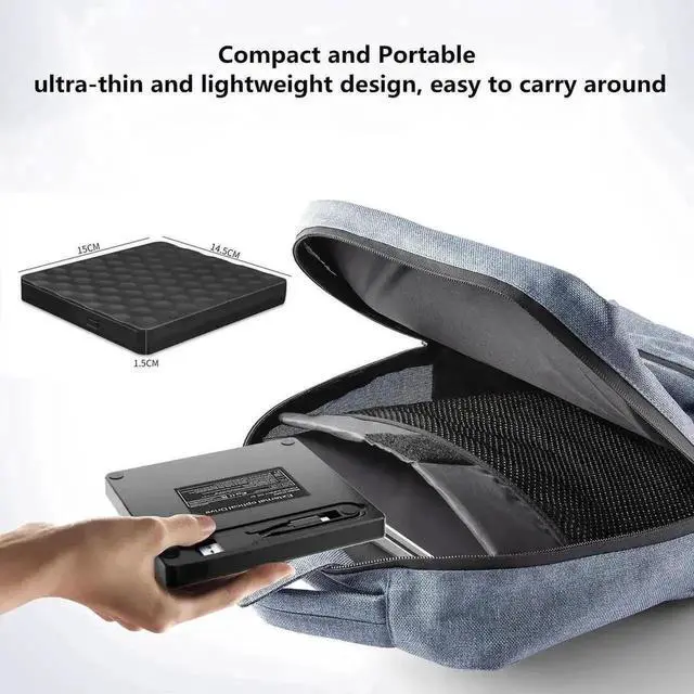 - USB optical drive produces almost no noise while processing discs and thus won't be disturbing.