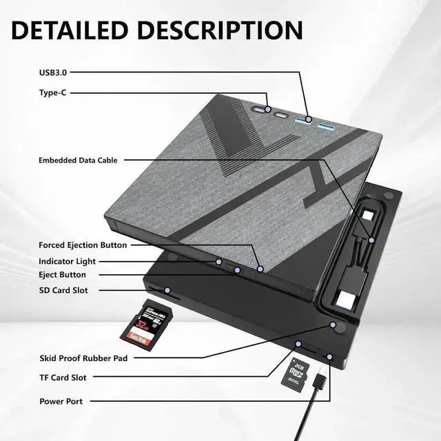 It supports reading DVD/CD discs and writing DVD/CD discs. You can easily copy music, movies, and data files from SD cards, TF cards, or through the USB/Type-C ports to your computer.