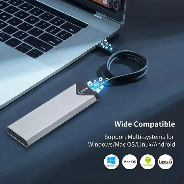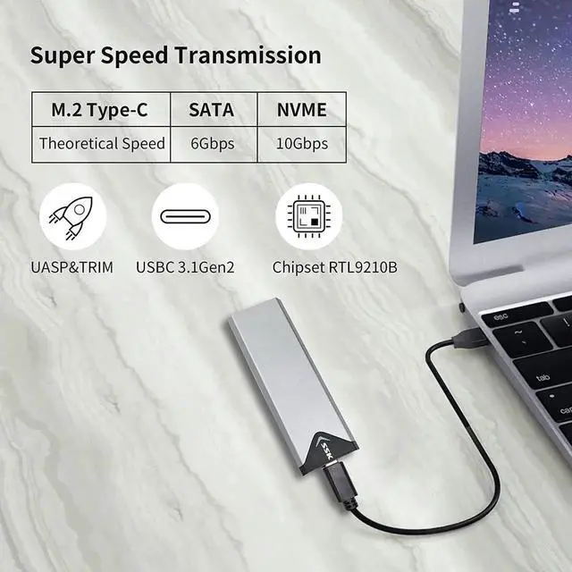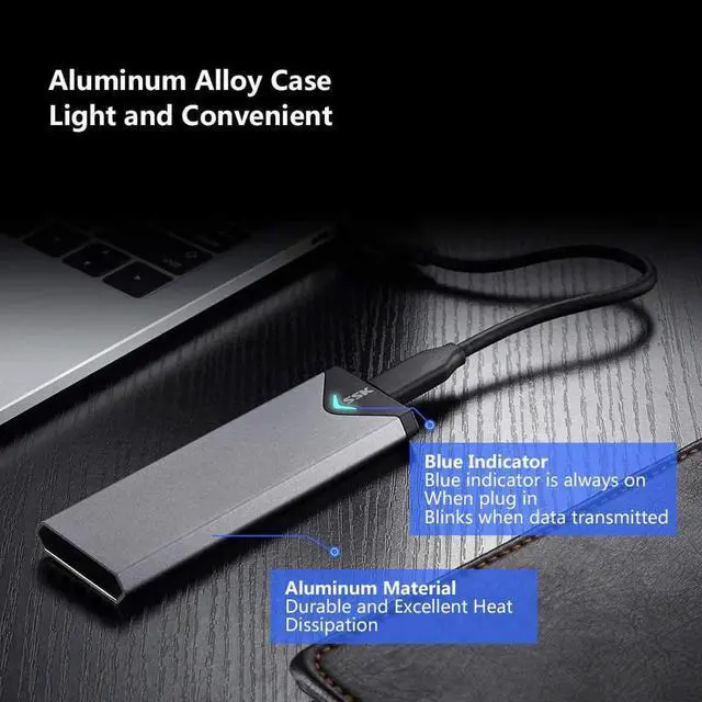Note: NVMe and SATA SSD are not included. Type C interface- Both side can be inserted; M. 2 NVME recommends USB-C Gen 2 10Gbps or Thunderbolt 3 for extreme speed performance. One HD movie transfer only takes 2 seconds; Backward compatible with USB 3.1 Gen1 and USB 3.0 up to 5Gbps. Aluminum Alloy Shell- Adopts aluminum alloy shell slim design durable and excellent heat dissipation be portable and easy to carry. Package includes 2 x Thermal Padboth USB Type-C and USB 3.0 (Type-A) cables and a Screw Driver. Blue Indicator- Blue Indicator shows the data transfer status easy and clear; As with all SSDs new media must be formatted before use. SSD file system must be supported on host operating system to be accessible. High Quality Master Chip- Adopts high performance controller IC Chipset RTL9210B Complies with UASP and Trim which can effectively improve the speed and exteend the lifetime of SSD. Compatible Multi OS Windows 7/ 8/ 8.1 / 10/ Linux/ MAC. Plug-and-play no additional drivers required. Bus powered does not need an external power supply.
