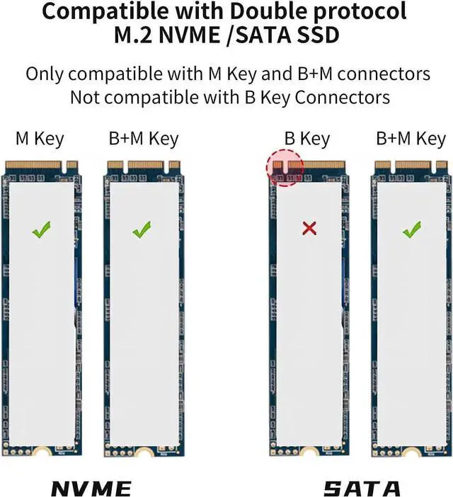 Applicable SSD - This M. 2 SSD Enclosure only for NVMe PCIE SATA M-Key / B+M connectors M. 2 SSD. Applicable to sizes 2242 / 2260 / 2280 solid state drivers. Does not support M. 2 PCIe AHCI SSDs M. 2 PCIe devices such as WiFi and capture cards mSATA SSDs and non-M. 2 form factor SSDs.
