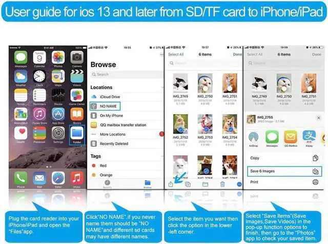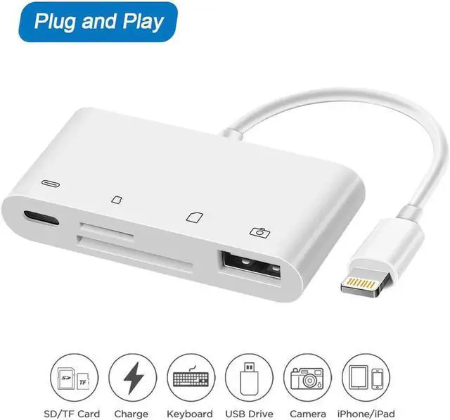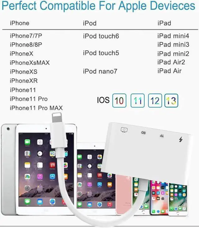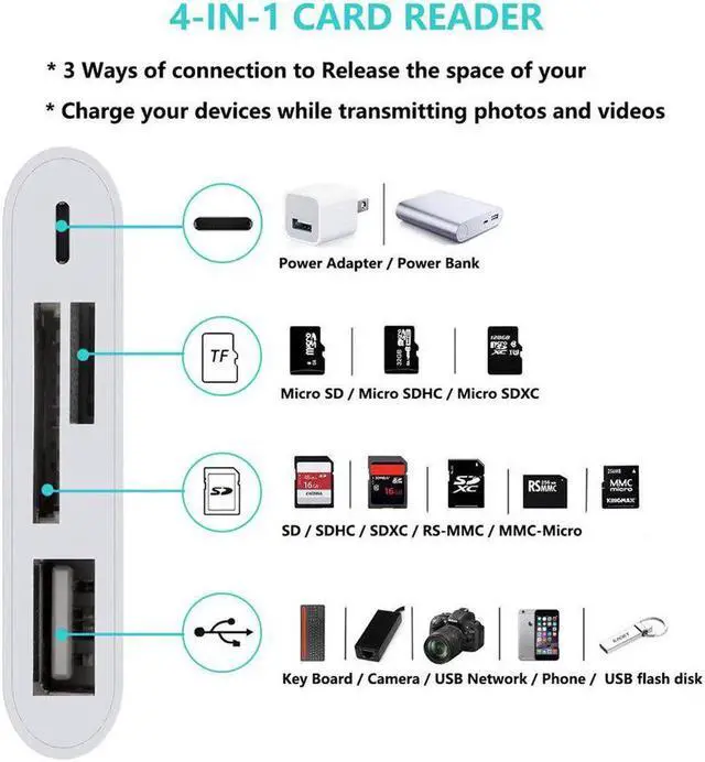 Multi-Function: Compatible with iPhone to SD card reader with 1*USB 2.0 female port, 1*SD Card port (SD / SDXC / SDHC / RS-MMC / MMC Micro Card), 1* TF Card port / Micro SD (Micro SDXC / Micro SDHC / Micro SD Card), 1 * Female 8 pin charging port