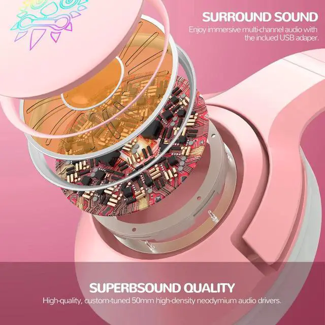 K9 Gaming Headset with Removable Cat Ears, for PS5, PS4, Nintendo Switch, PC, with Surround Sound, RGB LED Light & Noise Canceling Retractable MicrophonePink