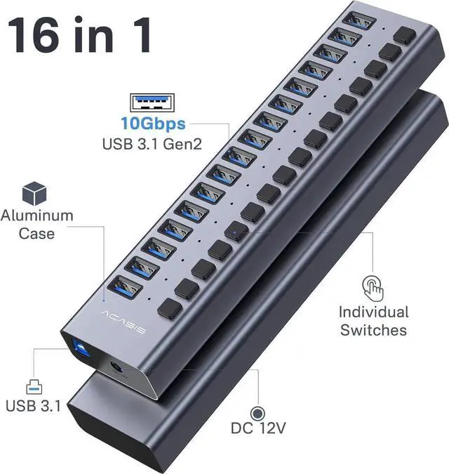 USB 3.1 Hub: Enhanced power (12V 8A) for more stable support of multiple devices you can charge your devices like mac mobile phones tablets or other devices safely without any pressure. Built-in surge protector keeps your devices and data safe and supports hot swapping. Aluminium Alloy HousingACASIS usb hub powered build with quality aluminium alloy which can helps disspate heat quickly and no worries from falling out from your desk when you plug many devices. [Independent Switch]- Each high-speed USB 3.1 (10Gbps) port of the 16 port USB 3.1 (10Gbps) hub has an independent switch which is more secure and can be directly pressed to turn on without removing the USB port cable. Each USB fast charging port of the multi USB Hub can deliver up to 2.1A of current. [Wide Compatibility] -16 port USB 3.1 (10Gbps) powered is compatible with most operating systems: Windows XP/Vista/7/8/10 MacOS-8/9/X UNIX Linux and offers fast PLUG-AND-PLAY installation.