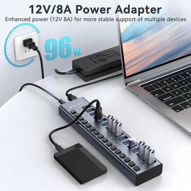 USB 3.1 Hub: This USB 3.1 hub features 16 ports with 10Gbps data transfer speed will greatly improved your work productivity and connectivity. 96W Powered
