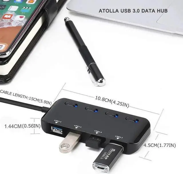 Product Description about 4 Port USB 3.0 data Hub with Individual Power Switches and LED lights. Number of ports: 4 ports USB 3.0 hub; Cable length : 15 cm(5.9in); Size : 105*45*15 mm(4.13in*1.77in*0.59in); Weight : 39g