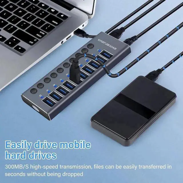 • Fast Data Transfer: USB 3.0 hub 10 port powered expansion delivers data speeds of up to 5 Gbps, 10x faster than USB 2.0, allowing you to transfer HD movies and photos, videos and music in seconds, without drivers. Powered USB Hub made of high-quality aluminum alloy, Plug and play, no drivers are required, fit for office, home and school.