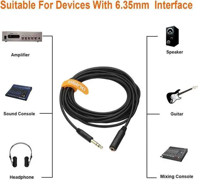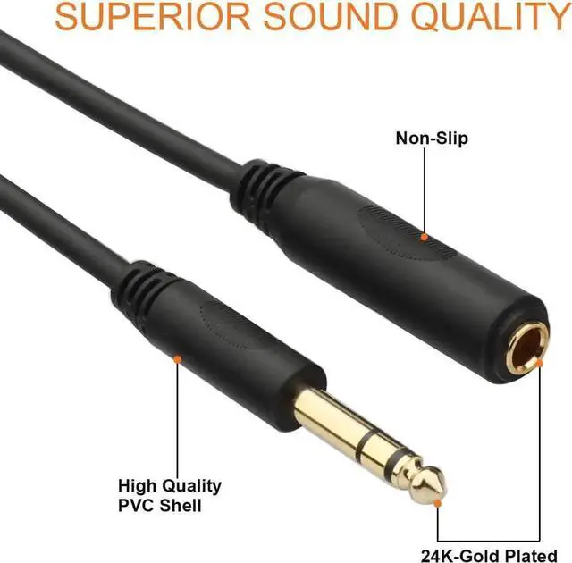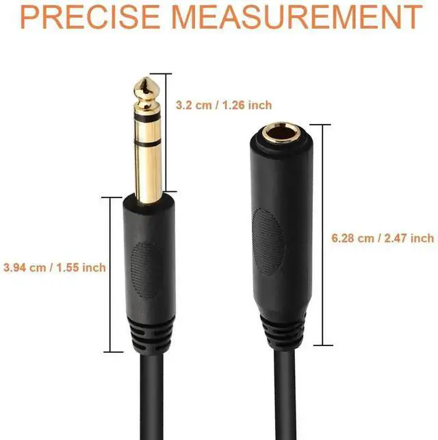 1/4 inch Headphone Extension Cable it's designed to extend the reach of hard-wired headphones with a stereo phone plug for connecting guitar headphones with standard 6.35 mm plug to audio devices with a 6.35 mm stereo jackHeavy Duty Gold-Plated Metal 6.35 mm connectors resist corrosion provide durability and improve the signal transmission ensures minimal signal loss20 AWG 4N Oxygen Free Copper with shielding ensure high fidelity sound quality and provide maximum conductivity and signal clarity. a great choice for music lovers It's especially great for studio or live performances. Heavy Duty Flexible Rubber Jacket Protect Your Cable the outer diameter of the cable is 5.0 mm( 0.2 inches) Top quality and made by environment-friendly material Polyethylene insulation improves high-frequency response strong flexible.