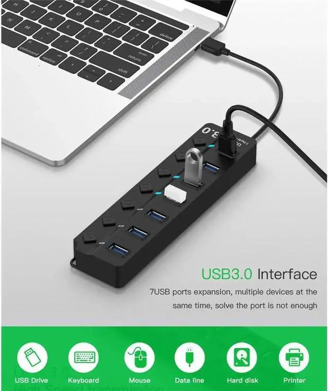 Multiple USB port. This USB 3.0 hub can expand 1 USB port to 7 extra USB data ports, including support for USB flash drive, mouse, keyboard, printer or any other USB peripherals.