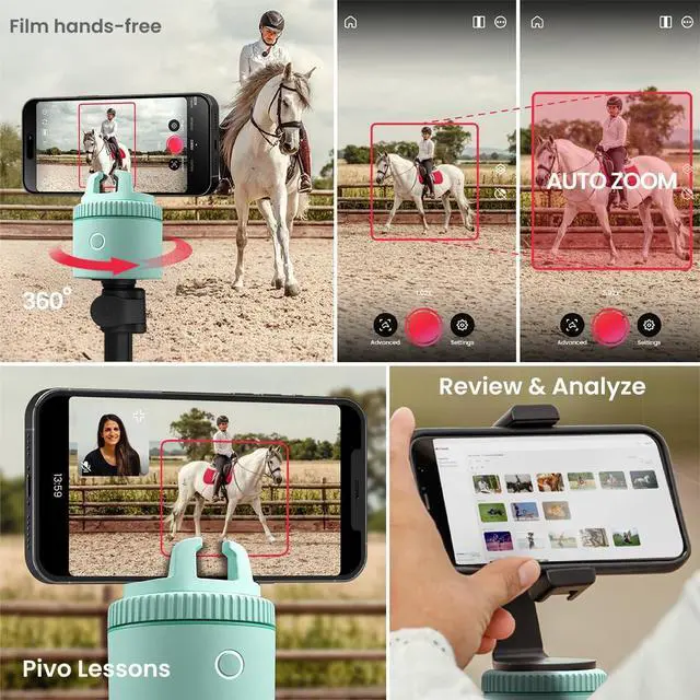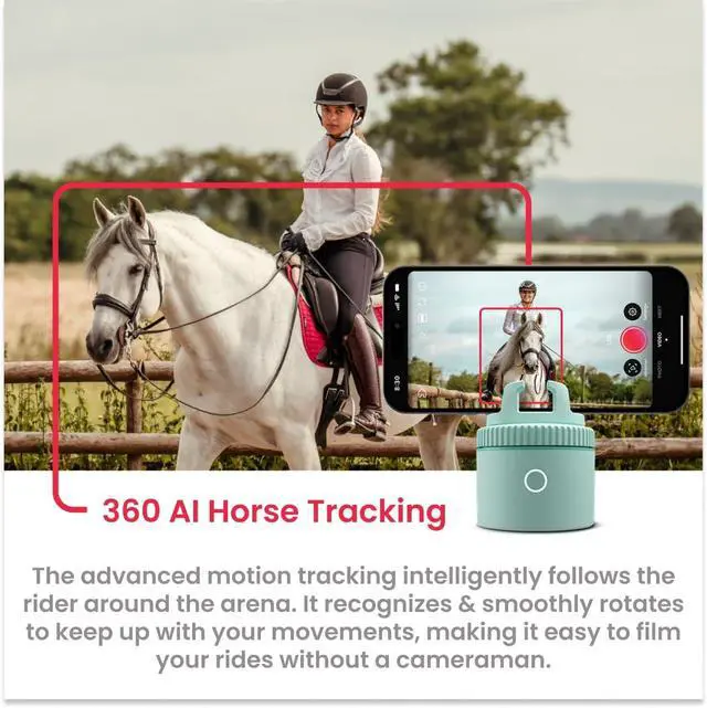 ADD MOVEMENT TO YOUR VIDEOS: Pivo Equestrian Pod uses 360° Auto Tracking powered by AI technology to turn your smartphone into a personal camera operator that captures your every move. Switch seamlessly between Face Tracking and Body Tracking to create videos that are more dynamic and engaging.