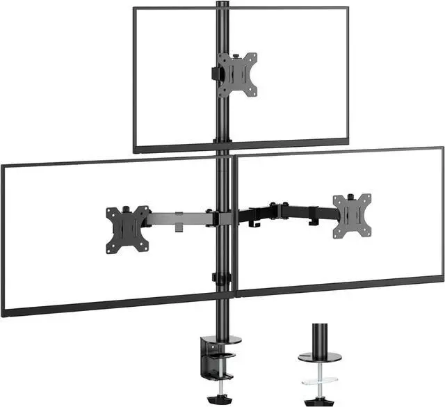 Universal CompatibilityTriple monitor desk mount for 17 to 32 inch screens,each arm holds up to 17.6 lbs. Flexible height adjustment. Detachable VESA plate for mounting holes 75x75mm and 100x100mm.