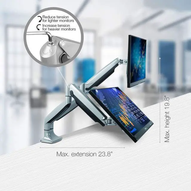 Strong Support: Designed with premium, articulating gas springs and heavy-duty aluminum, our computer monitor stand for desk spaces can hold nearly 20lbs per self-balancing arm.