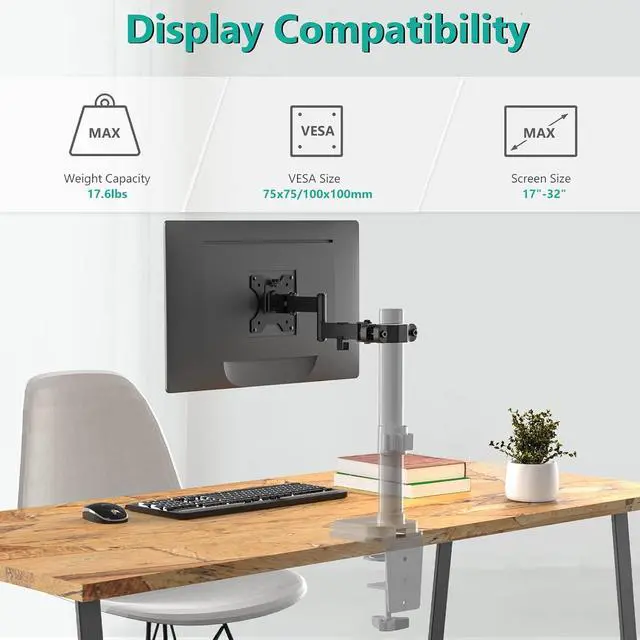 Design: Suit with most desk monitor mount and stand with 1.1 to 2.4inch diameter center pole. Fit one monitor up to 32, 17.6lbs and support with Mounting Holes size 75x75mm and 100x100mm.