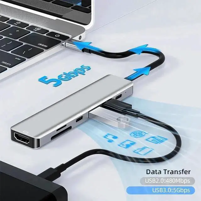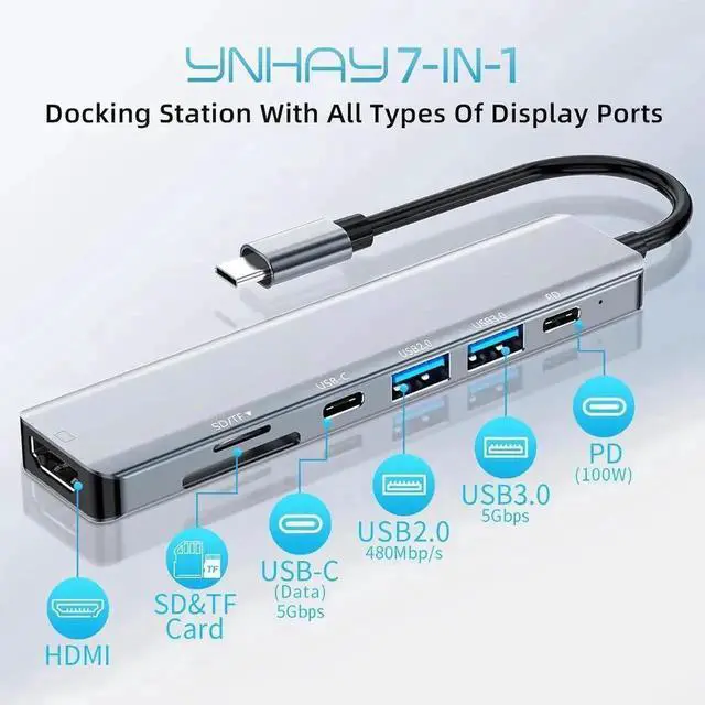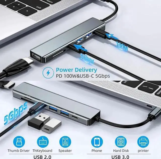 [7-in-1 USB-C Hub] USB Hub with 1* 4K HDM port, 1*100W Power Delivery (PD) port, 1* USB-C and USB 3.0 5Gbps data ports, 1*MicroSD card slot, and 1*SD card slot, multiport connectivity to satisfy all your expansion needs, and provide your work efficiency at home, in the office or on the go.