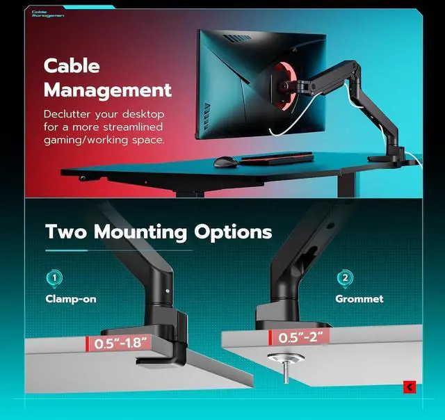 Save Desktop SpaceBy mounting your monitors on this heavy duty monitor arm, you can save a lot of desktop space and create a tidy and organized gaming space. The built-in cable management perfectly solves the problem of messy and tangled cables, free up your desktop.