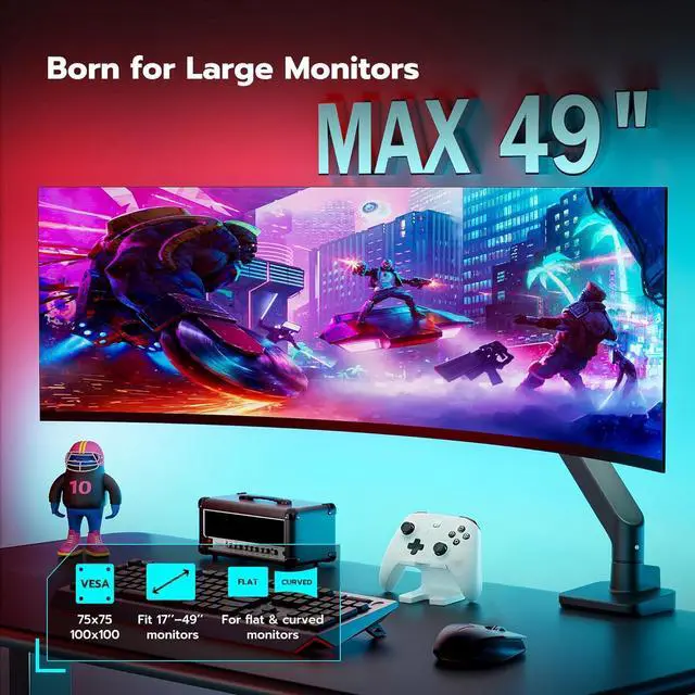 Support up to 49" & 44lbs MonitorsThe monitor desk mount supports most flat, and curved computer screens ranging from 17 to 49 inches, holding 4.4 to 44 lbs. Compatible with Samsung Odyssey G9, LG, and other 49" ultrawide monitors(not for tv) which with VESA mount adapter and equipped with 75x75mm and 100x100mm VESA mounting holes.