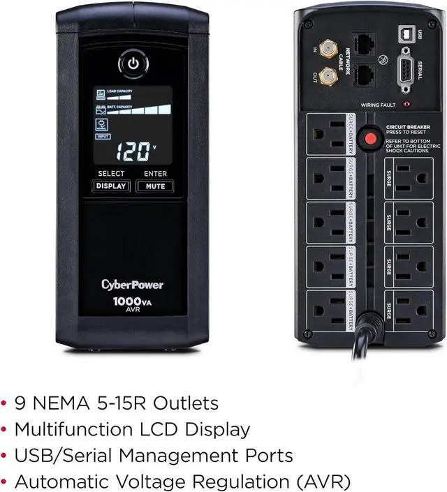 850VA/510W Intelligent LCD Battery Backup Uninterruptible Power Supply (UPS) System uses simulated sine wave output to safeguard workstations, networking devices, and home entertainment equipment