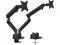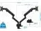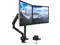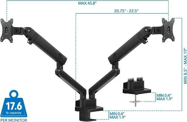 FULLY ADJUSTABLE: Two monitor stand arms can tilt up and down 90 degrees, swivel left and right 360 degrees, and raise/lower a total of 17.5 inches. Turn hex bolt on top of mechanical springs to set the counterbalance tension and hold screens in place.
