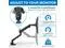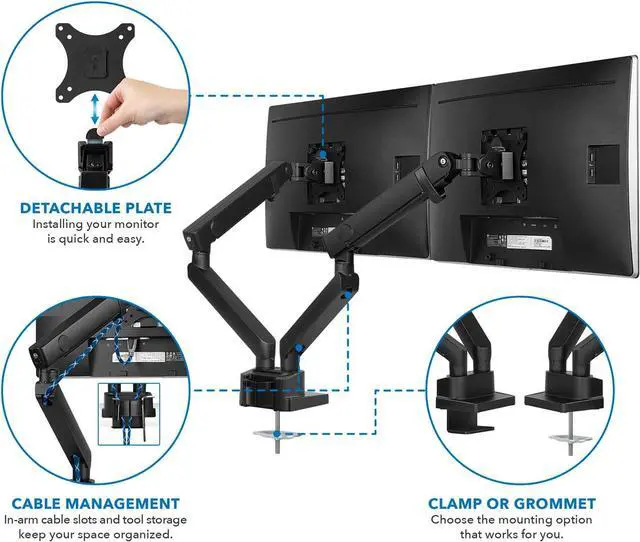 FEATURES: Dual monitor arm has counterbalanced, mechanical spring arms which are easily height adjustable. Detachable VESA plate comes off with the push of a button, making installation super simple, and slides back on with a click. Integrated cable management keeps your cables out of sight and neatly organized. Comes with interchangeable C-clamp or grommet base mount for use on desktops.