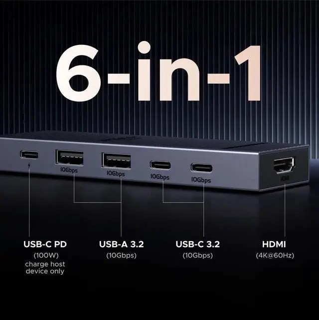 6-in-1 10Gbps USB C Hub: Inspire more potential of your laptops USB-C port with two 10 Gbps USB-C 3.2 Gen 2 port, two 10 Gbps USB-A 3.2 Gen 2 ports, 4K 60Hz HDMI and 100W Power Delivery. Ultimate all-in-one dock, works on multiple ports simultaneously