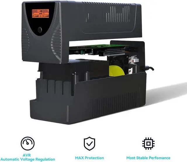 AVR and Sockets:Automatic Voltage Regulation protects connected devices by stabilizing incoming voltage levels.4 Outlets provide battery backup and surge protection(Battery is charged),2 outlets provide surge protection only(Mains electricity is connected).