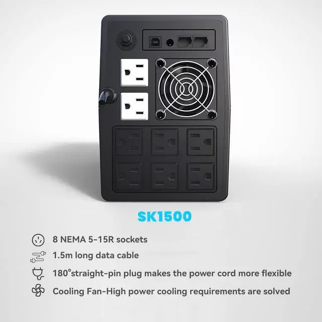 AVR and Sockets:Automatic Voltage Regulation protects connected devices by stabilizing incoming voltage levels.4 Outlets provide battery backup and surge protection(Battery is charged),2 outlets provide surge protection only(Mains electricity is connected).
