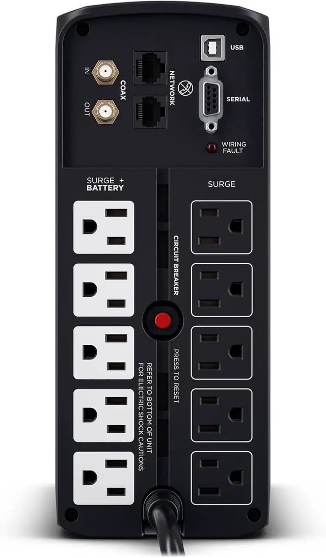 10 NEMA 5-15R OUTLETS: Five battery backup & surge protected outlets, Five surge protected outlets; INPUT: NEMA 5-15P right angle, 45 degree offset plug with six foot power cord; 2 USB charge ports (2.1 Amps shared) to power portable devices