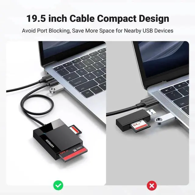 Compact Design: 2.17*2.68*0.59 inches(L*W*H) / 1.7 ft cable, carry it anywhere. UGREEN USB 3.0 SD Card Reader is a great addition for workers on the go