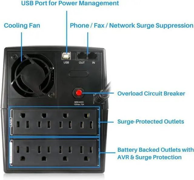 Power Management Software: Monitors your computer via USB connection and automatically shuts it off during a power disruption in case you are not in front of your computer to do so