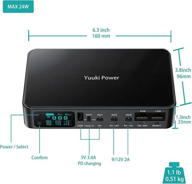 2. Works with DC 5V3.6A, 9V2A, 12V2A, plus PoE 15V1.3A or 24V0.8A for your CCTV. USB-A and USB-C ports support PD fast charging