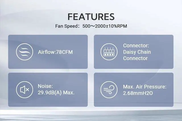 [PWM Functional]The PWM fan control allows for dynamic speed adjustment between 500 rpm to 2, 000 rpm, minimizing noise or maximizing airflow. Noise: 29.9dB(A) Max.