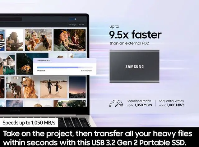 SHARE IDEAS IN A FLASH: Dont waste a second waiting and spend more time doing; The T7 is embedded with PCIe NVMe technology that brings fast read and write speeds up to 1,050/1,000 MB/s¹, making it almost twice as fast as the T5