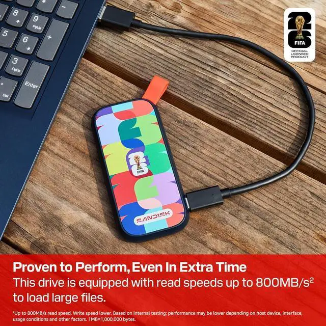 Solid state performance with up to 800MB/s read speeds in a portable drive. (Based on internal testing; performance may be lower depending on host device, interface, usage conditions and other factors. 1MB=1,000,000 bytes.)