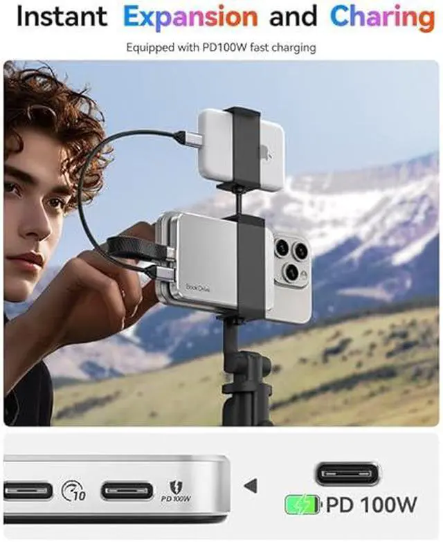 Instant expansion with PD 100W: Charge your laptop, phone, or tablet at full speed (up to 100W) through the Portable SSD's USB-C port while accessing your files.