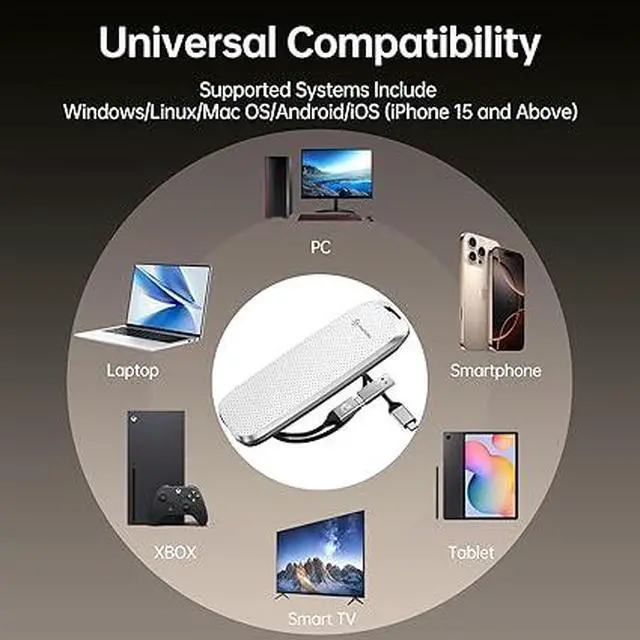 UNIVERSAL COMPATIBILITY, ZERO CONFIGURATION: Features a reversible Type-C interface and includes a high-quality 0.3m 2-in-1 USB C to USB C & USB A cable. Plug and play support for iPhone 15/16/17 Serie, Type C Android, Windows, Mac OS, Linux, with no drivers required. Perfectly for laptops, tablets, smartphones, cameras, gaming consoles and more.