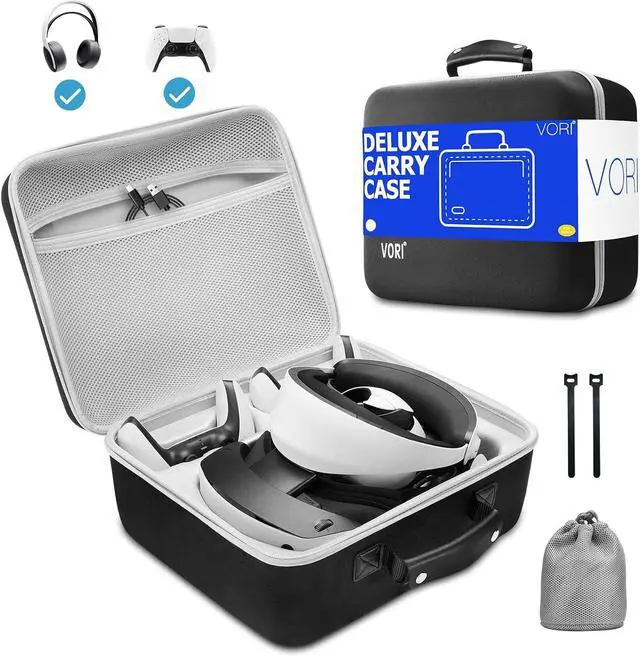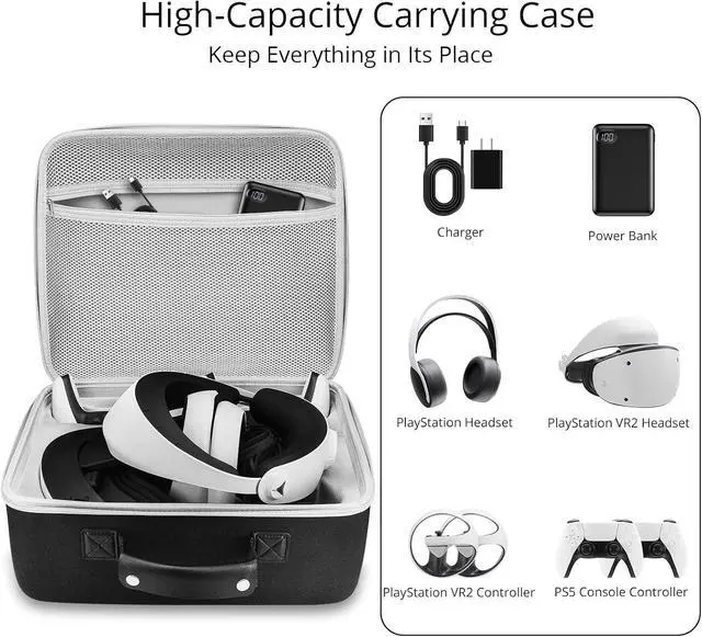 Securely Store and Protect Your PS VR2 System - This psvr2 case offers customized compartments for the PlayStation VR2 headset, 2 sense Controllers, 2 PS5 Console Controllers, and PlayStation headset. The mesh storage bag provides convenient storage for all charging cables, power adapters and other PlayStation vr2 accessories. Keep your PlayStation VR 2 system neatly stored and easily accessible