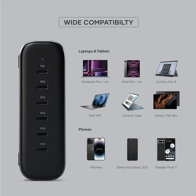 On-the-Go Convenience - Perfect for both home and travel, this charging station doubles as a versatile charger for multiple devices. Its practical design ensures seamless integration into any workspace, while its portability makes it ideal for travel. Stay powered and organized with this versatile USB C charger block that works with a wide range of laptops, tablets, and phones. Please use certified charging cables (sold separately).