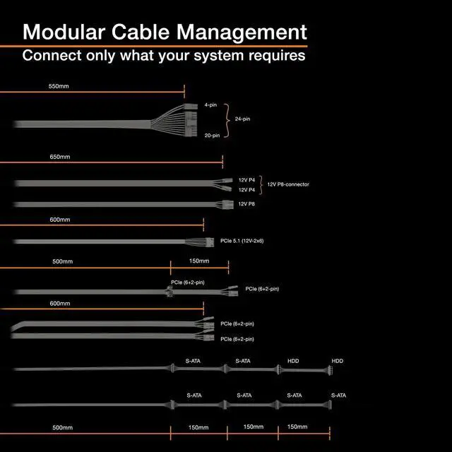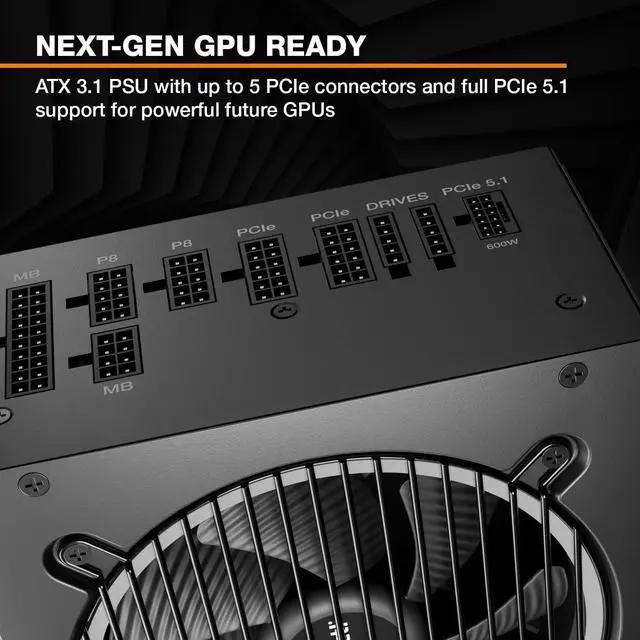 FUTURE-PROOF YOUR SYSTEM Fulfills all ATX 3.1 specifications Pure Power 13 M 750W is an ATX 3.1 PSU and comes with both native integration of the 12V-2x6 connector for next-generation PCIe 5.1 graphics cards, and 4 PCIe 6+2-pin connectors for support of current-gen GPUs. This makes the PSU extremely versatile and the perfect choice for powerful systems of today and the ones to come.