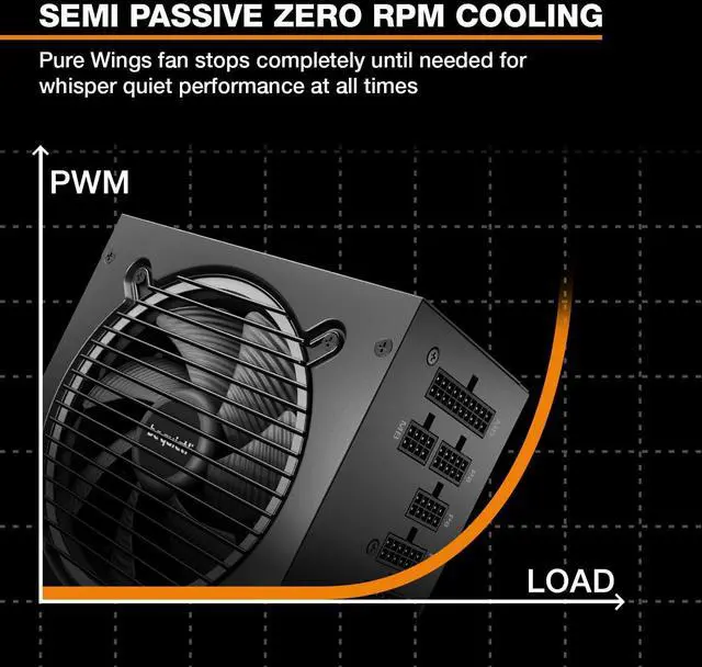 SEMI-PASSIVE ZERO-RPM COOLING Enjoy the silence While under low load, the fan turns off completely until its services are needed again for more demanding operations. This feature, combined with the reliable be quiet! fan and its airflow-optimized fan blades, make Pure Power 13 M 750W exceptionally silent in all load scenarios
