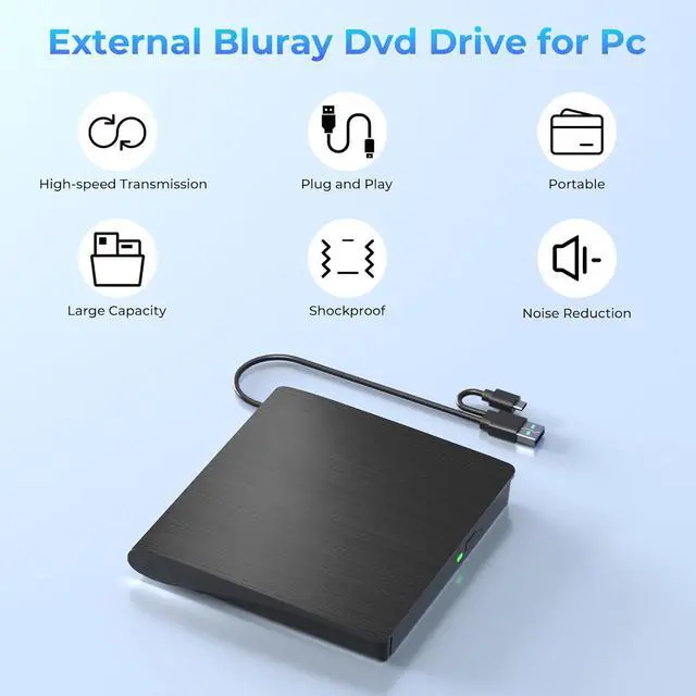 Portable & User-Friendly: This stylish external blu ray drive is crafted for easy portability and storage convenience. The dual-interface design combines two separate USB cables into one, allowing seamless connections to computers featuring either Type-C or USB 3.0 interfaces. With its intuitive design, it's incredibly easy to transport and utilize on-the-go. Besides, we've included a slip-proof rubber pad to prevent sliding on the desktop, and recessed cable design for easy storage and space saving