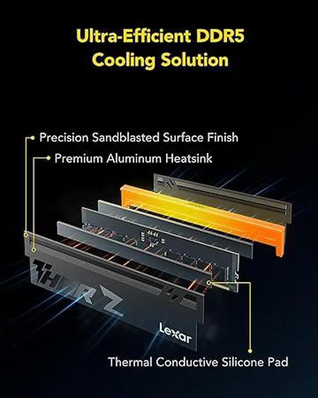 Sleek, Minimalist, Robust Aluminum Armor Design. The all-new THOR design of Lexar THOR Z Series RGB DDR5 RAM features an updated, streamlined design that includes a solid aluminum heatsink and customizable RGB lighting. Premium aluminum heatsink with a sandblasted finish fuses razor-sharp aesthetics with uncompromising thermal control, delivering durability and cooling in a radically clean form.
