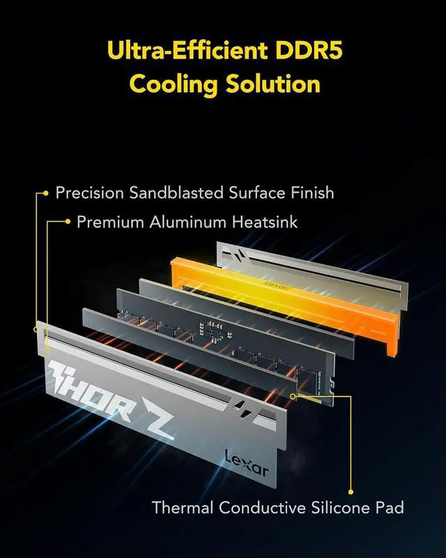 Sleek, Minimalist, Robust Aluminum Armor Design. The all-new THOR design of Lexar THOR Z Series RGB DDR5 RAM features an updated, streamlined design that includes a solid aluminum heatsink and customizable RGB lighting. Premium aluminum heatsink with a sandblasted finish fuses razor-sharp aesthetics with uncompromising thermal control, delivering durability and cooling in a radically clean form.