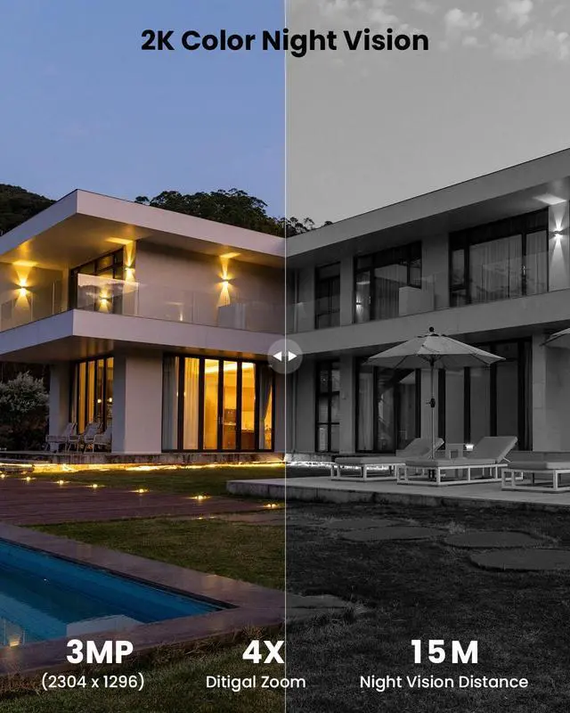 2K Video & Colorful Night VisionThe outdoor camera has a 1/2.7'' 3Mega CMOS image sensor resulting in 2K 3MP pixels. Ultra-bright floodlight security camera brings up to 25m(82ft) color night vision, with a 130° View Angle, the security camera with light presents a wider full-color lane and protects the safety of vehicles in all directions.