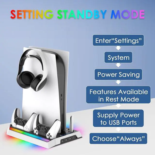 Tips: To charge controllers when the PS5 is off, simply enable "Supply Power to USB Ports" in the console's Rest Mode settings. This allows the dock to charge your controllers while the system is in standby