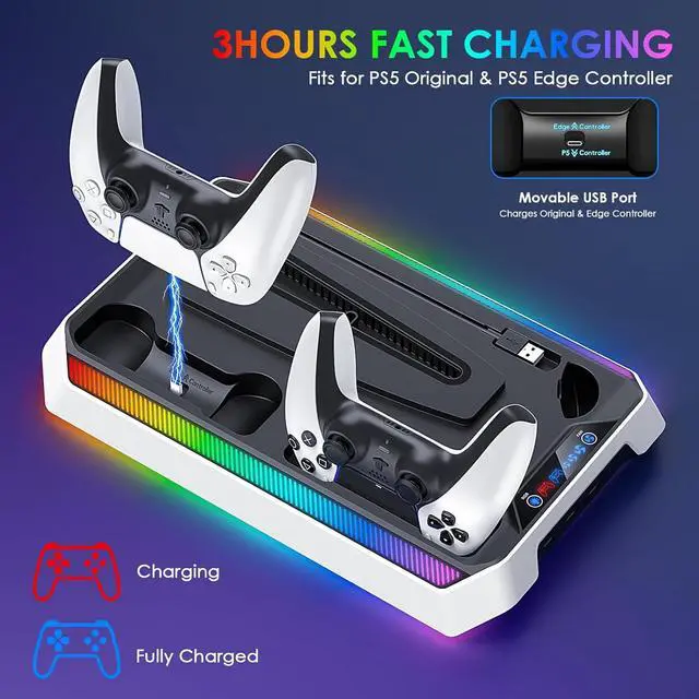 Fast Dual Controller Charging: The fast charging station supports both ps5 standard and edge controllers, making it easy to dock and charge without wobble or disconnect issues. Indicator lights show charging status at a glance.