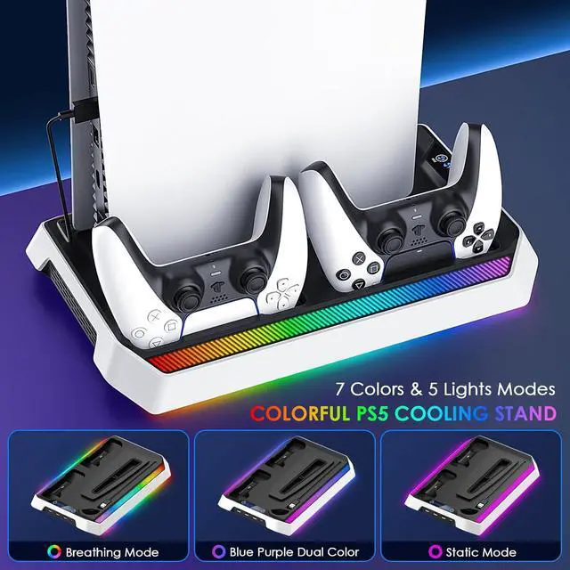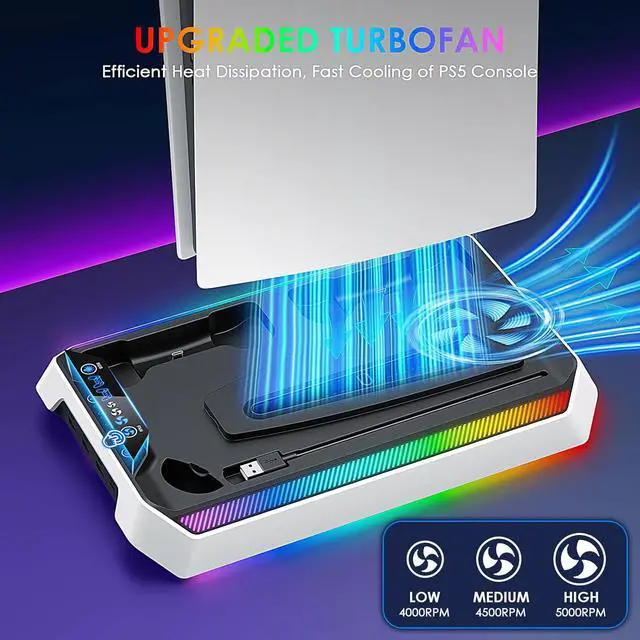 PS5/Slim/Pro Cooling Station, RGB P5 Controller Charger for PS5 Accessories, Ultra Quiet Cooling Fan for PS5 Digital/Disc Console, with 3 Level Fan, 4 USB Hub