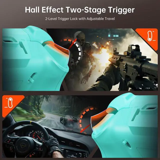 • Precision Hall Effect Joysticks & Dual-Stage Triggers: Featuring drift-free Hall sensors, the joysticks have a durability of up to 5 million uses and a precision deviation of less than 1%, delivering smooth and accurate control. Dead zones can be finely adjusted from 050% to create a personalized feel. The dual-stage trigger locks allow you to switch seamlessly between quick-fire and full-range control, perfect for FPS shooters, racing, and action games.