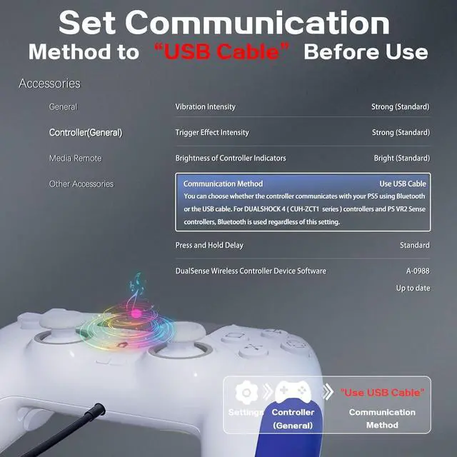 Setup Before Use - " ", otherwise the controller for PS-5 will not work. (Settings> Accessibility> Controller (General)> Communication Method> Select Use USB Cable)